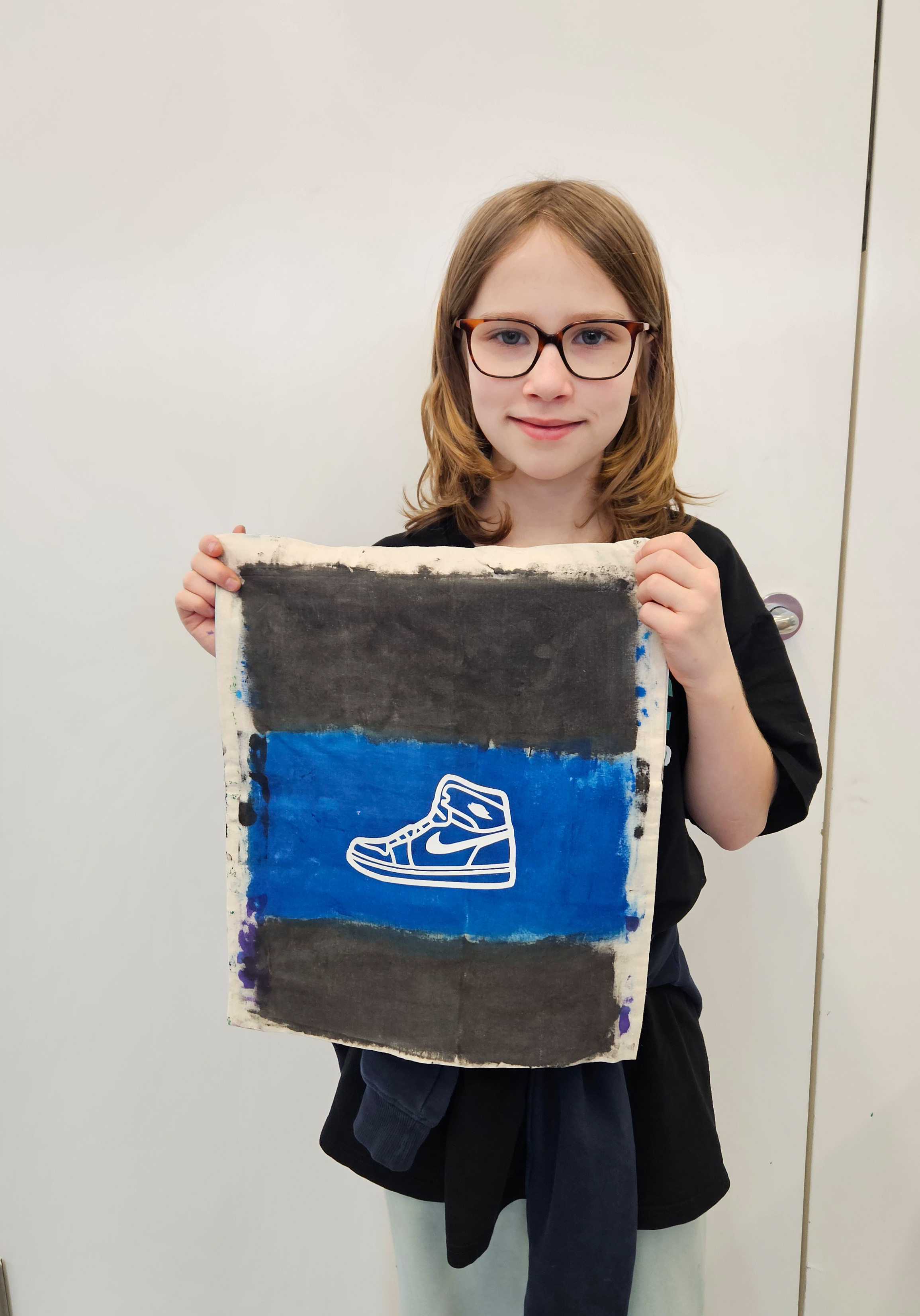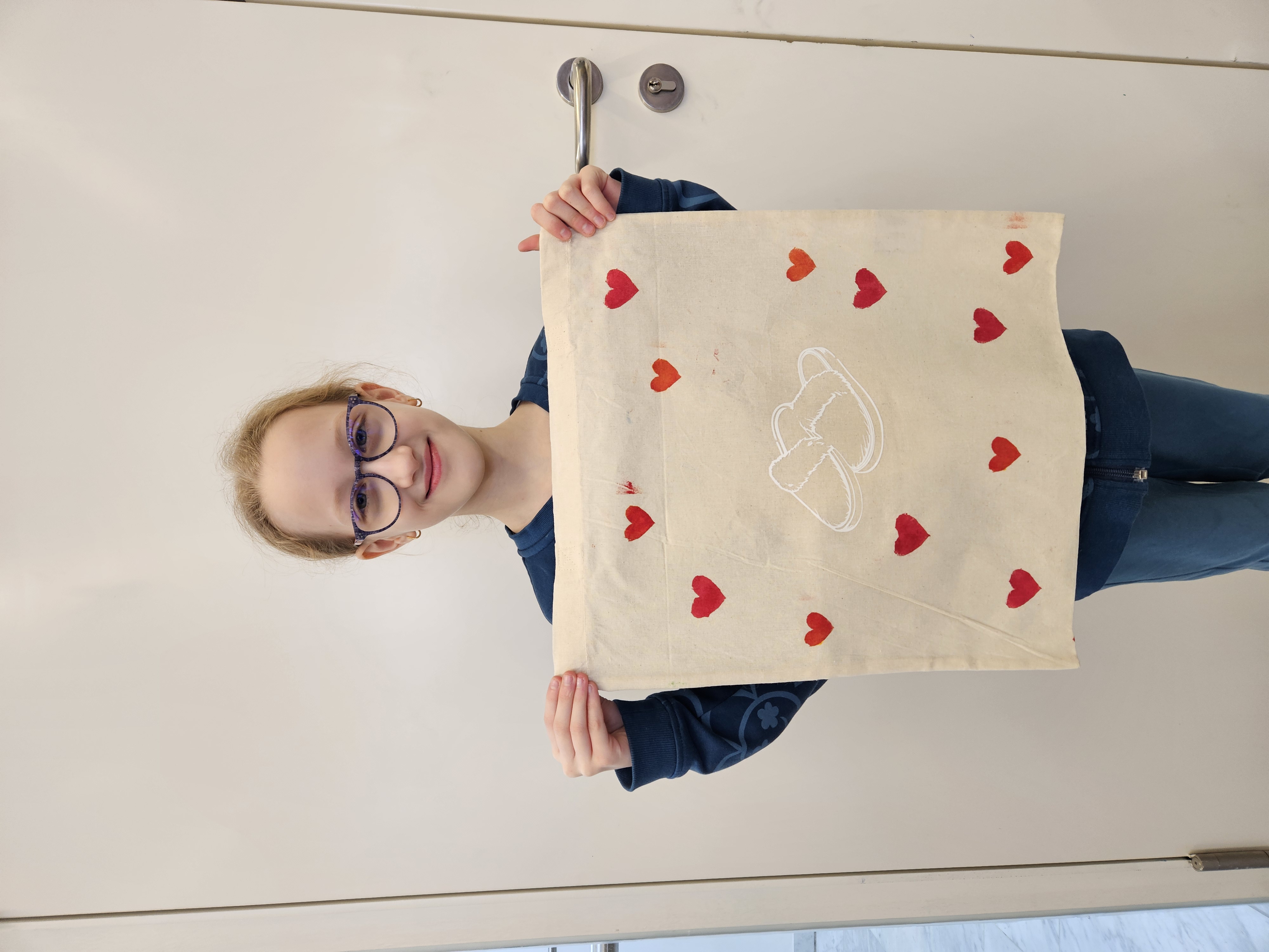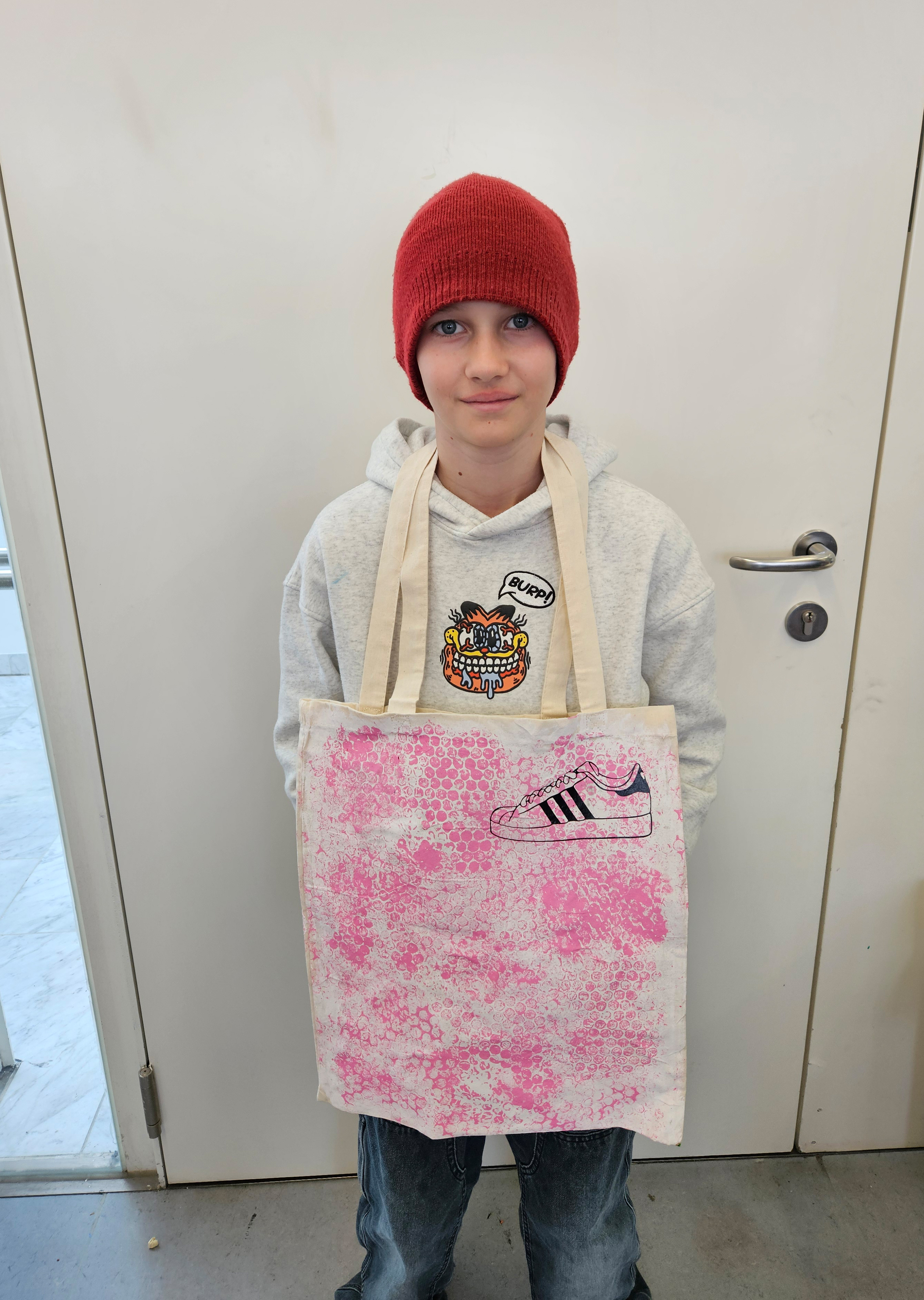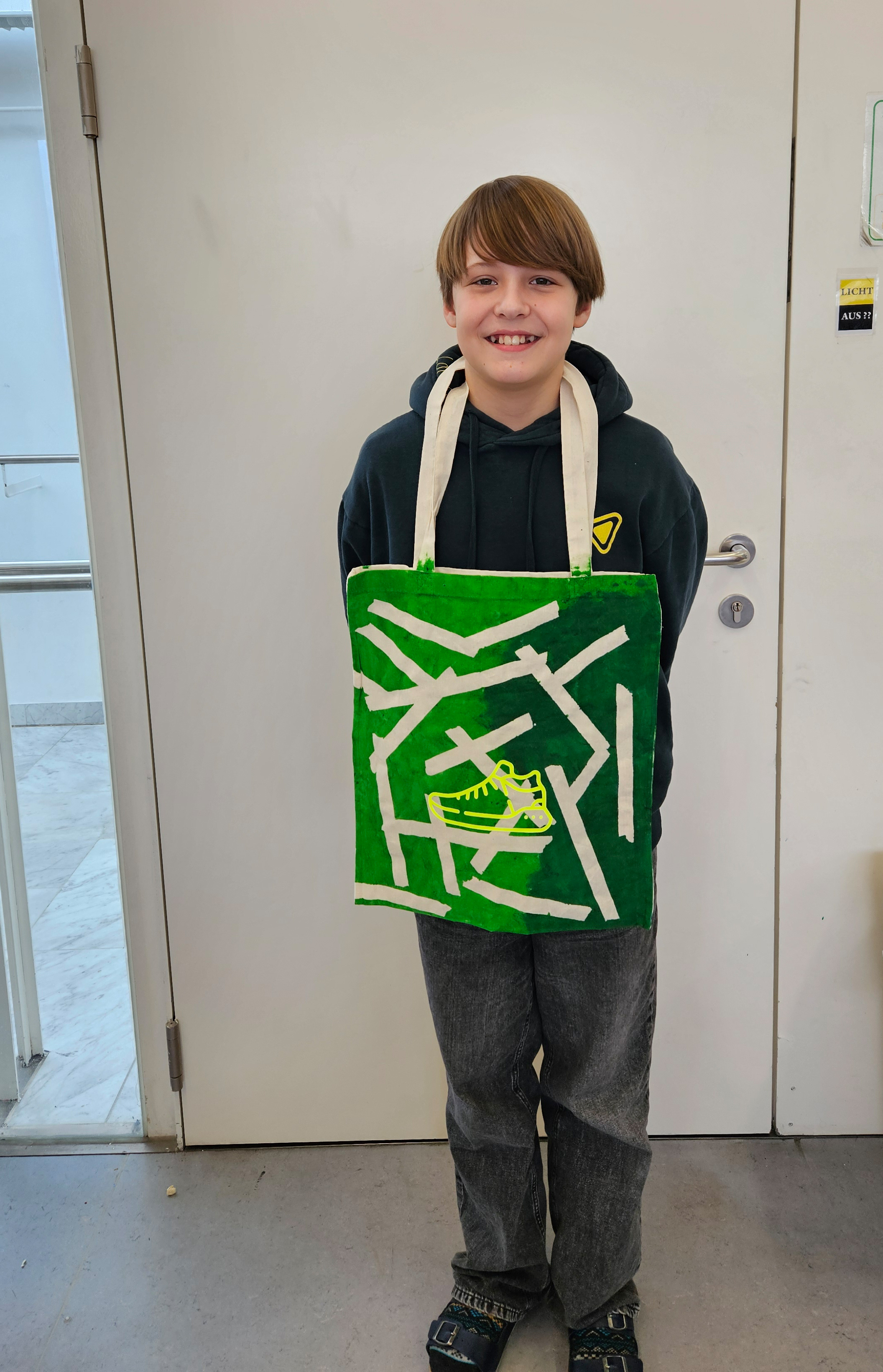 Zuerst verschafften sich die Schüler:innen einen Überblick über verschiedene textile Drucktechniken. Anschließend wurden Stoffbeutel nach eigenem Design bedruckt. Die Schüler:innen konnten hier aus dem Vollen schöpfen und wendeten Reservetechniken sowie den Materialdruck an, um bunte Hintergründe für ihre Beutel zu gestalten.
