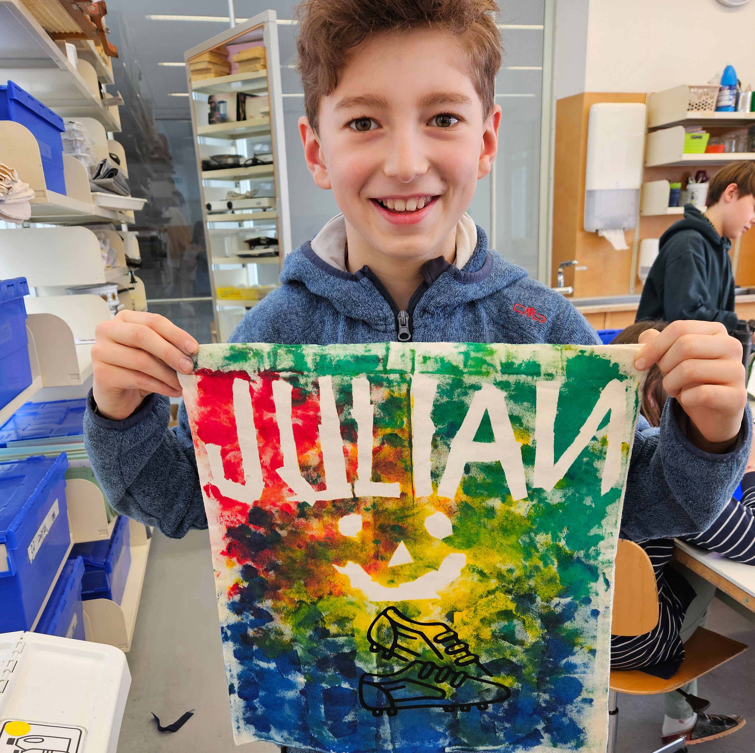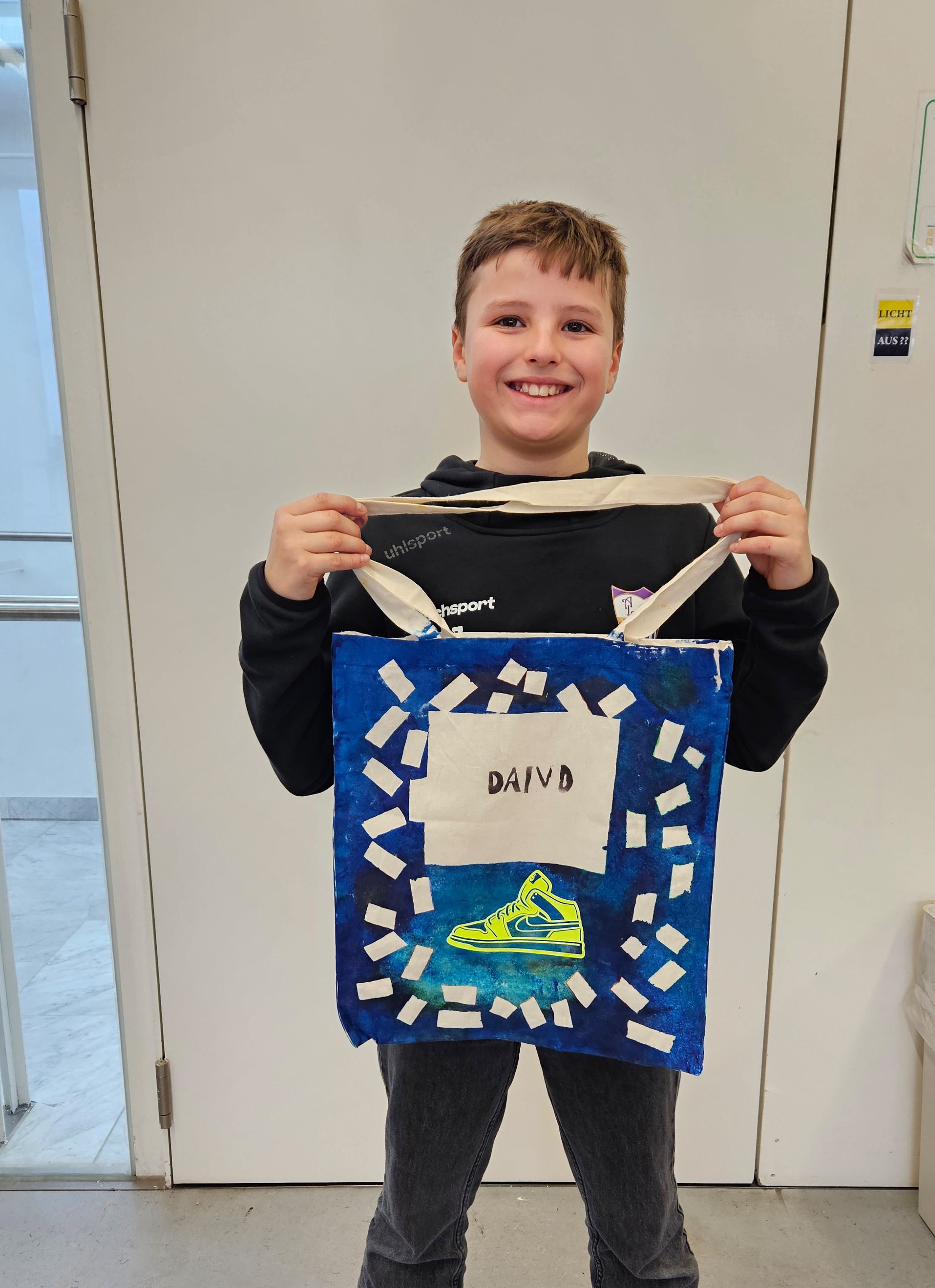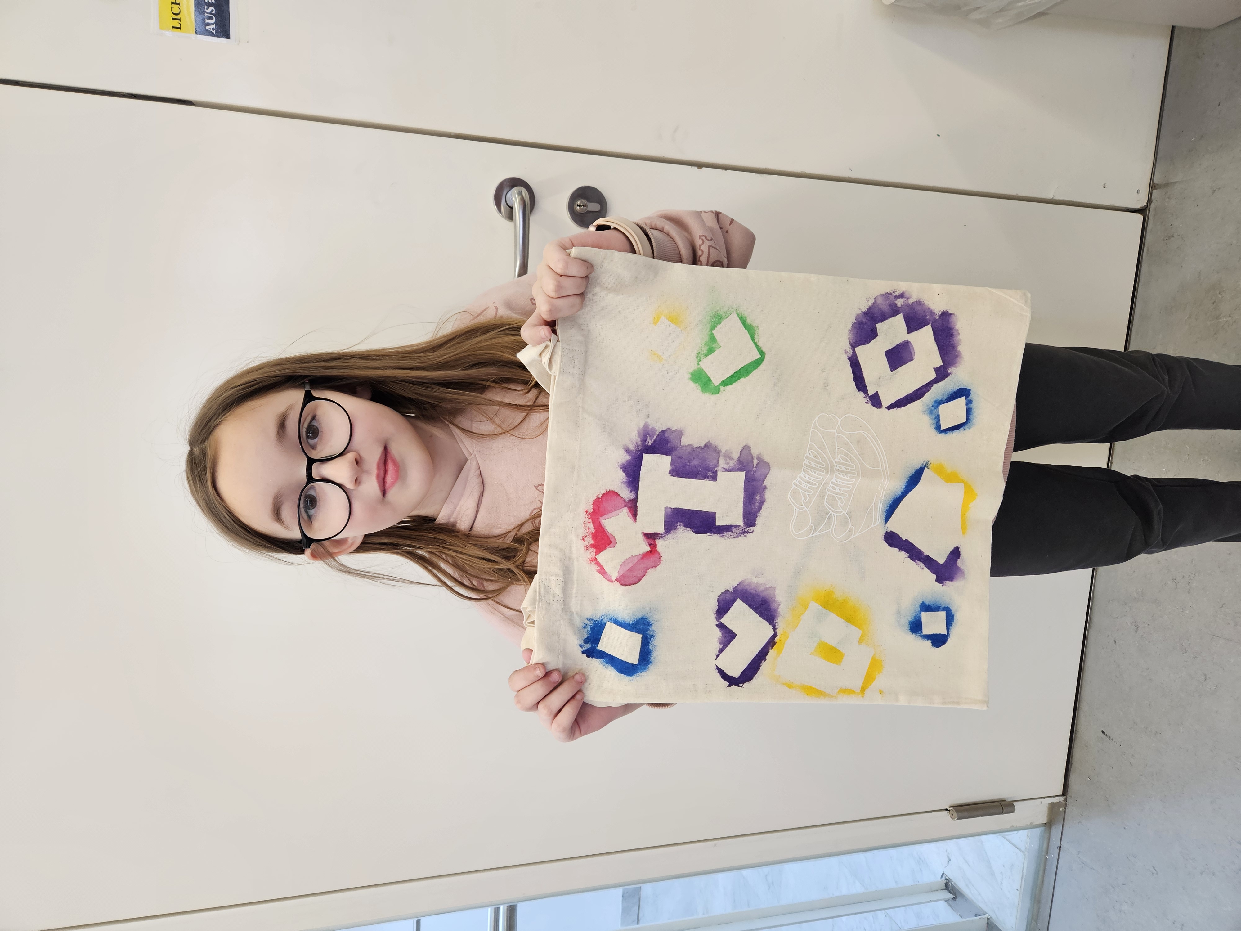 Zuerst verschafften sich die Schüler:innen einen Überblick über verschiedene textile Drucktechniken. Anschließend wurden Stoffbeutel nach eigenem Design bedruckt. Die Schüler:innen konnten hier aus dem Vollen schöpfen und wendeten Reservetechniken sowie den Materialdruck an, um bunte Hintergründe für ihre Beutel zu gestalten.