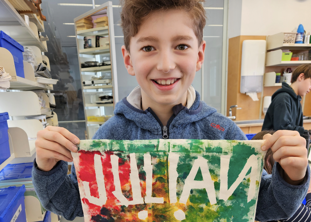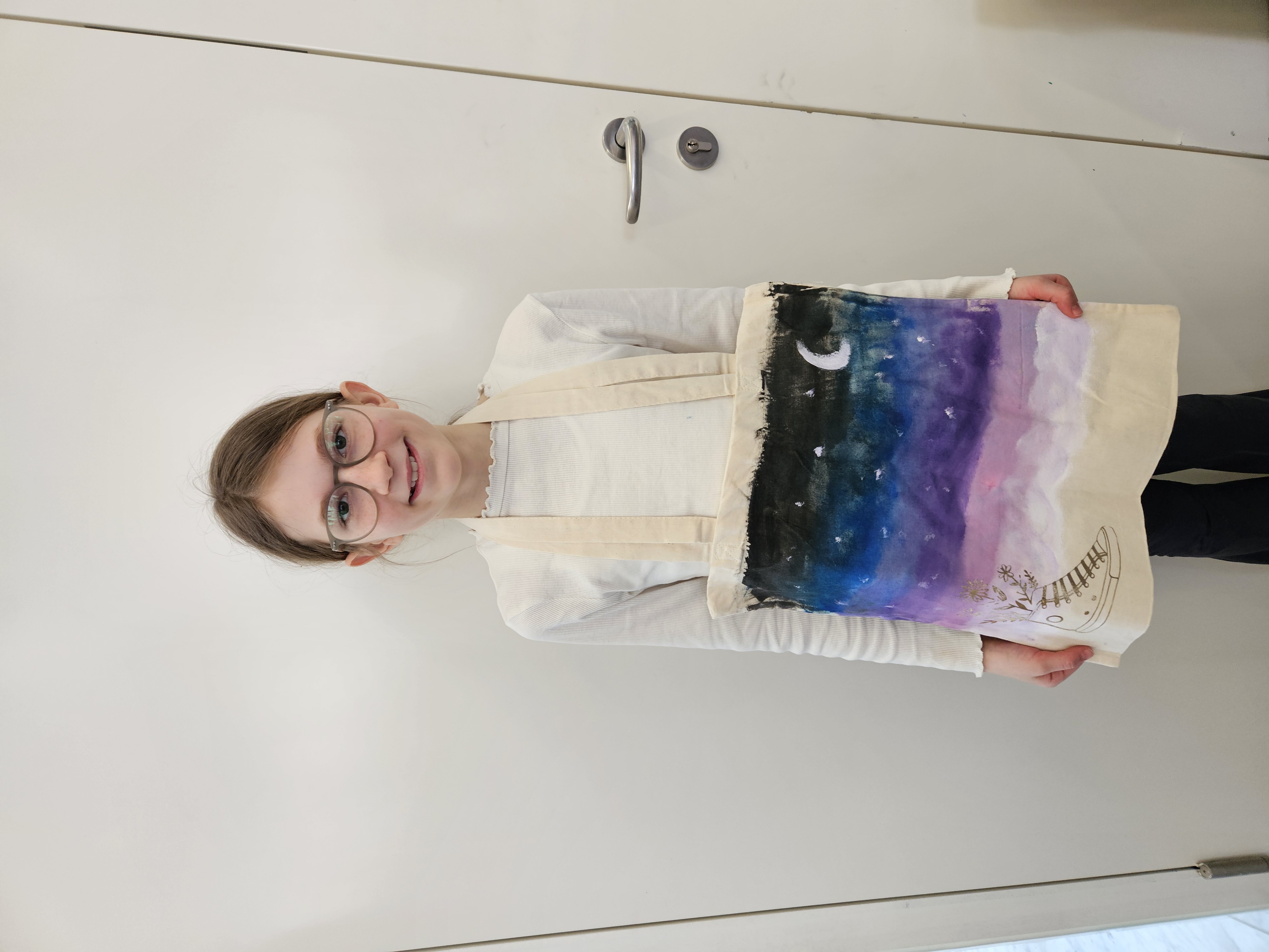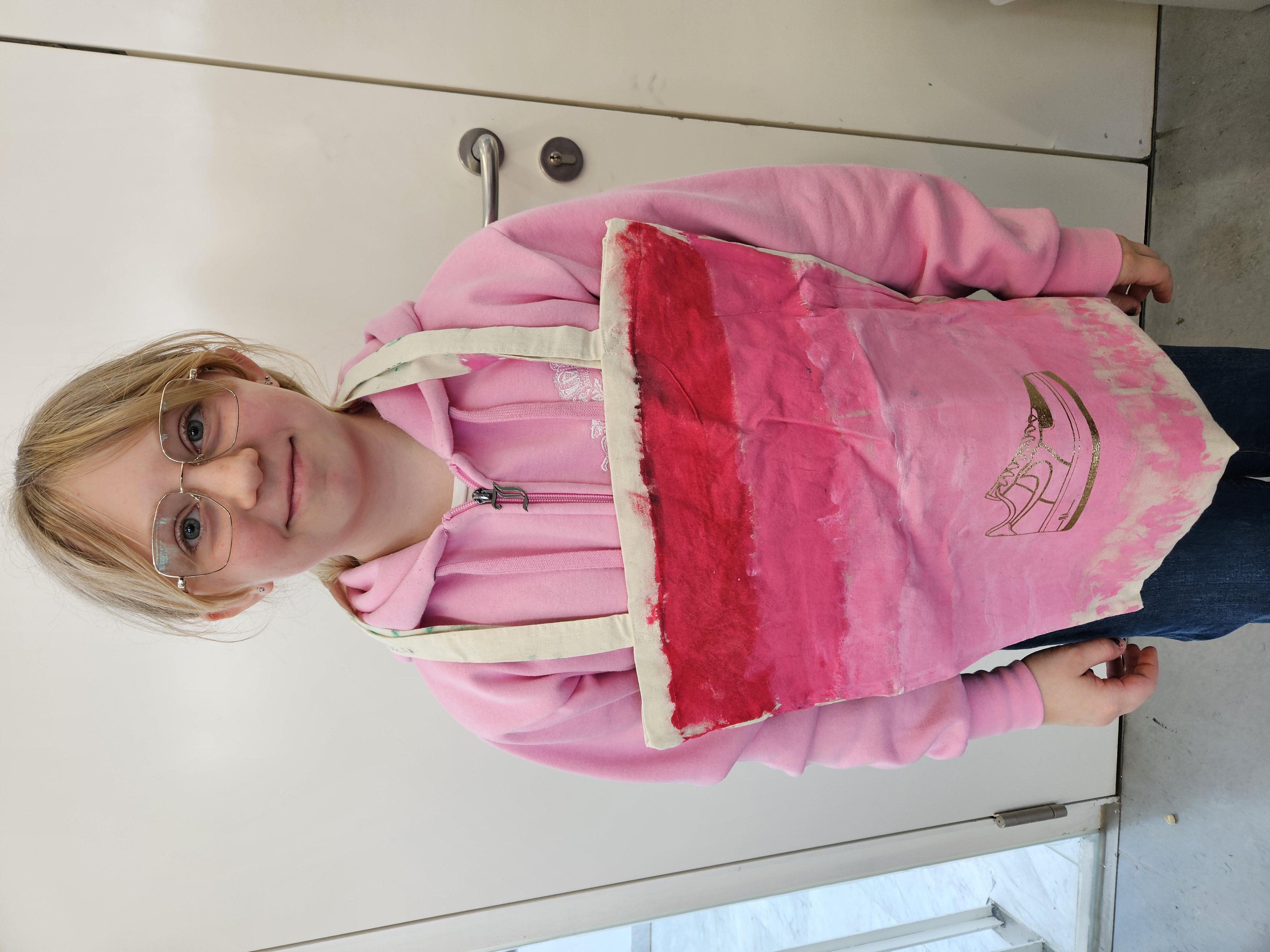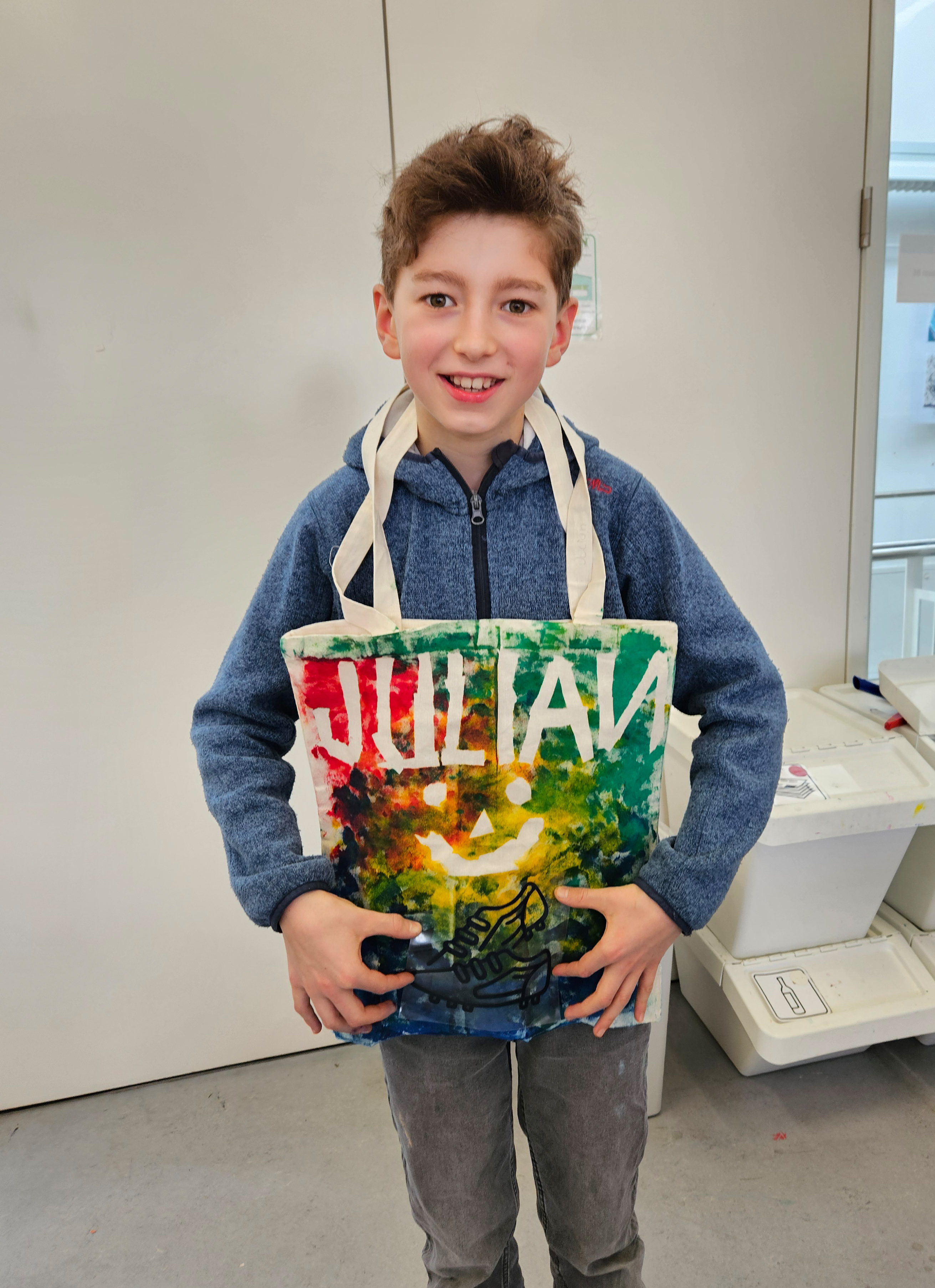 Zuerst verschafften sich die Schüler:innen einen Überblick über verschiedene textile Drucktechniken. Anschließend wurden Stoffbeutel nach eigenem Design bedruckt. Die Schüler:innen konnten hier aus dem Vollen schöpfen und wendeten Reservetechniken sowie den Materialdruck an, um bunte Hintergründe für ihre Beutel zu gestalten.