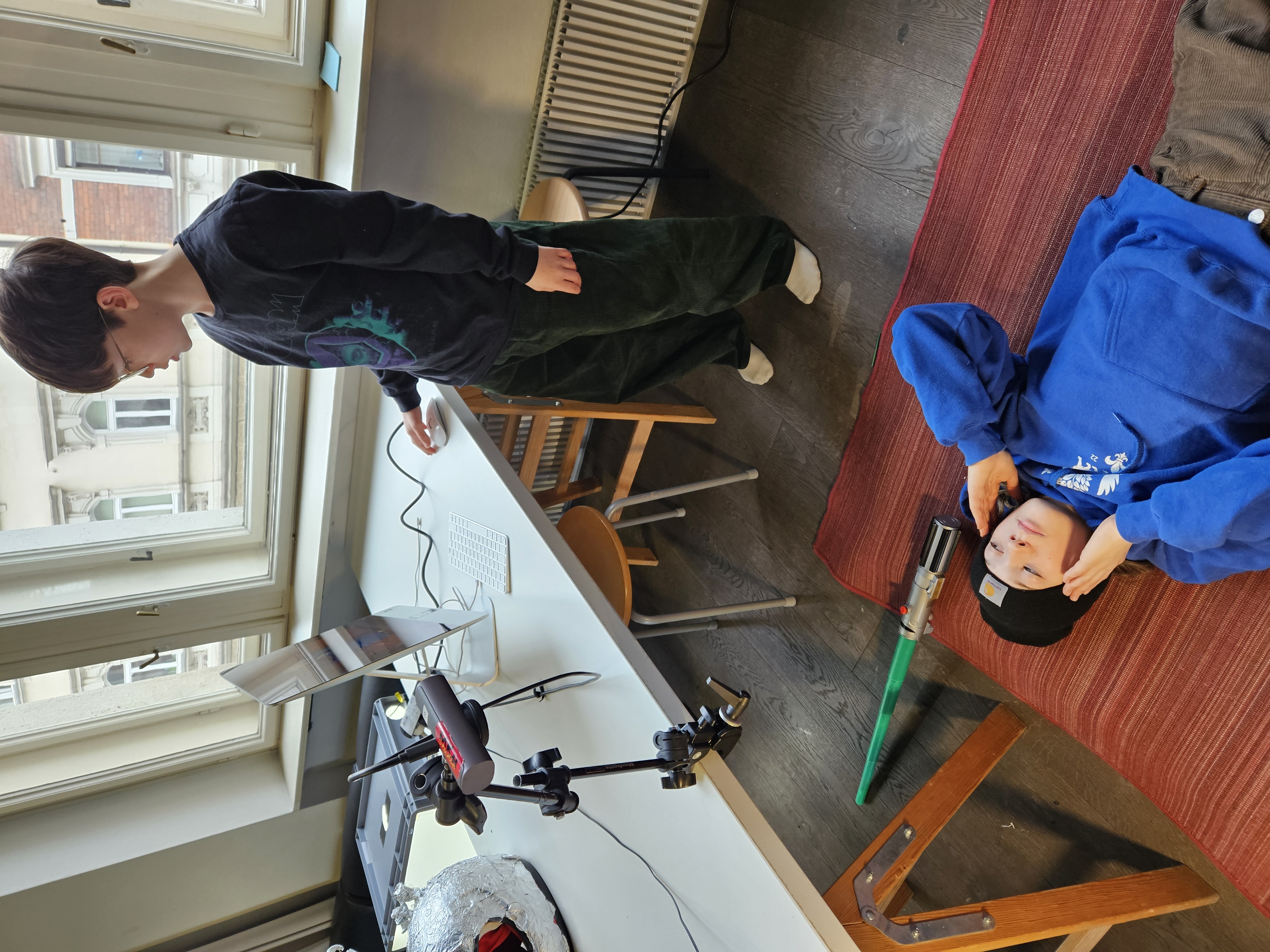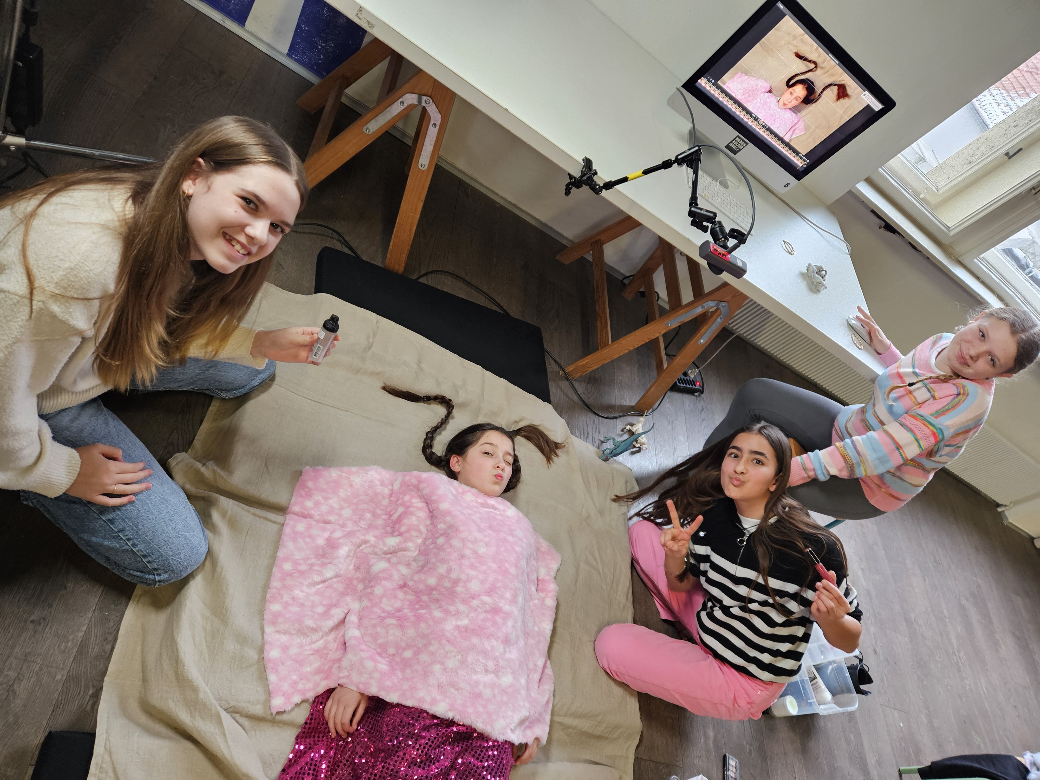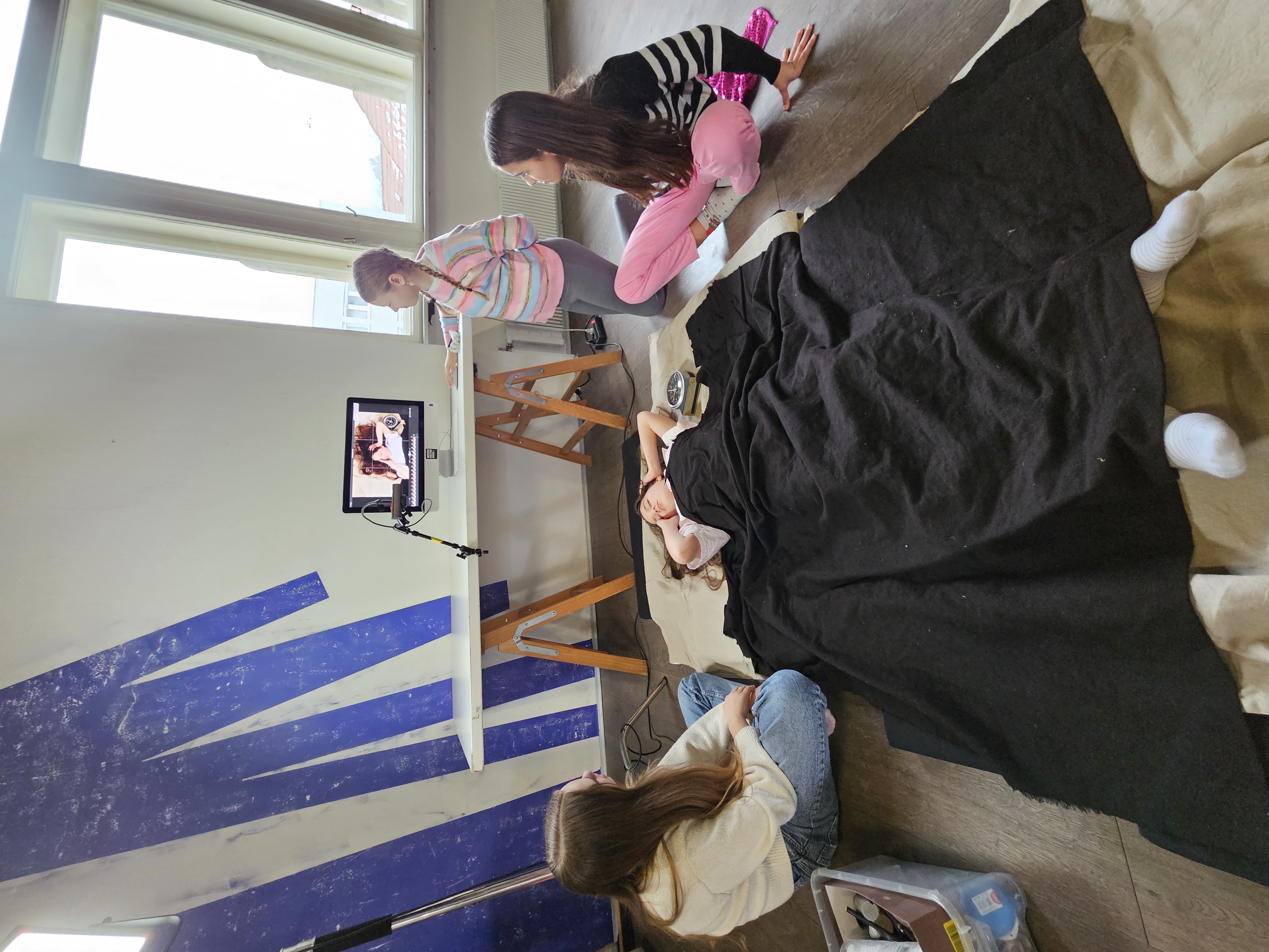 Hier wird, ebenso wie beim Legetrickfilm, mit der Kamera von oben auf darunter liegende Objekte gefilmt bzw. fotografiert. Nur dass die Objekte, die man Schritt-für-Schritt bewegt und abfotografiert dieses Mal keine ausgeschnittenen Papierformen waren, sondern unsere Schülerinnen und Schüler! Sie schlüpften auf diese Weise durch magische Portale und erlebten in Parallelwelten wilde Abenteuer: Sie kämpften gegen Aliens oder waren auf glitzernden Partys unterwegs. Einige von ihnen hatten auch großen Appetit. Oder haben wir das alles nur geträumt?