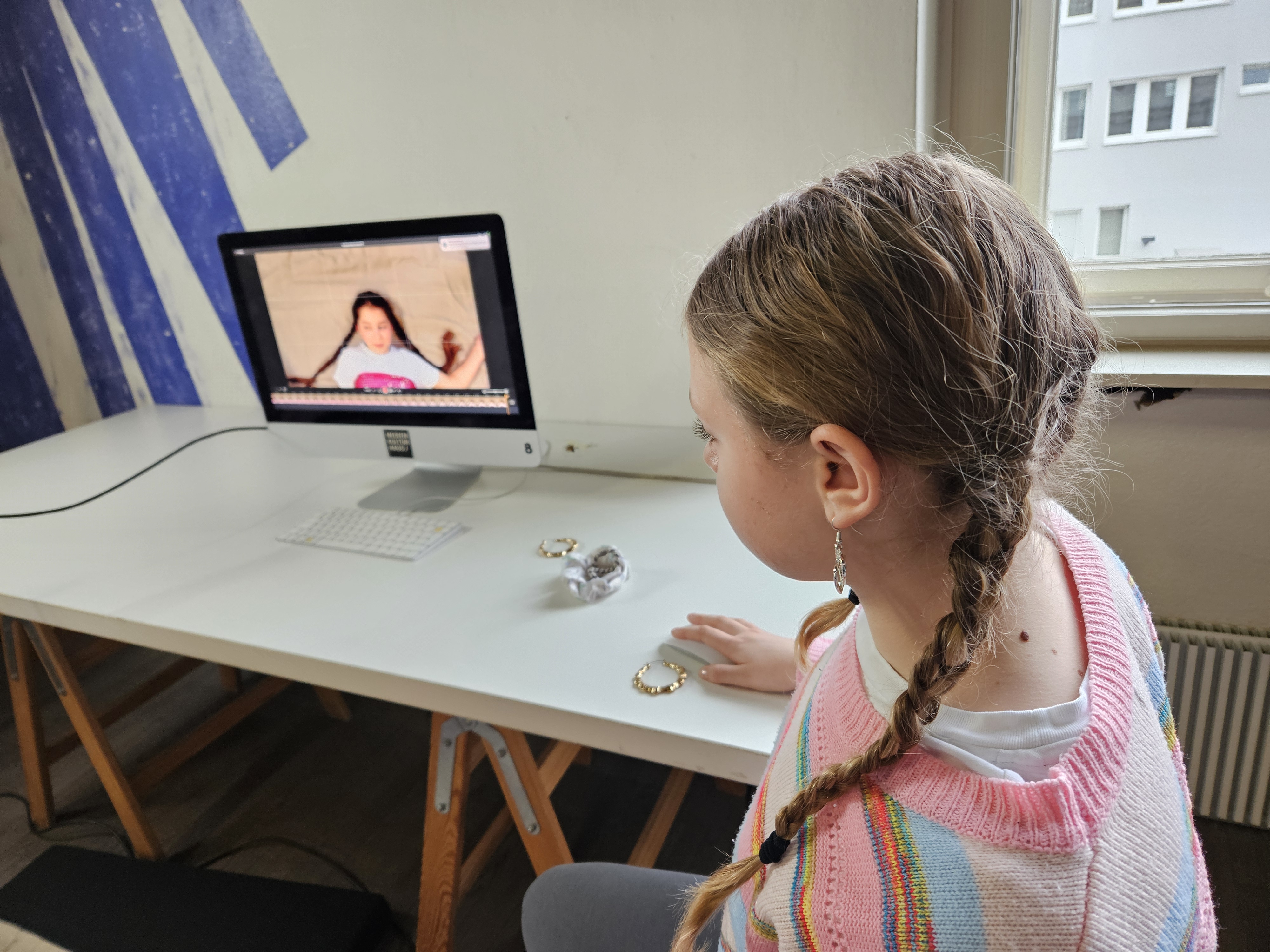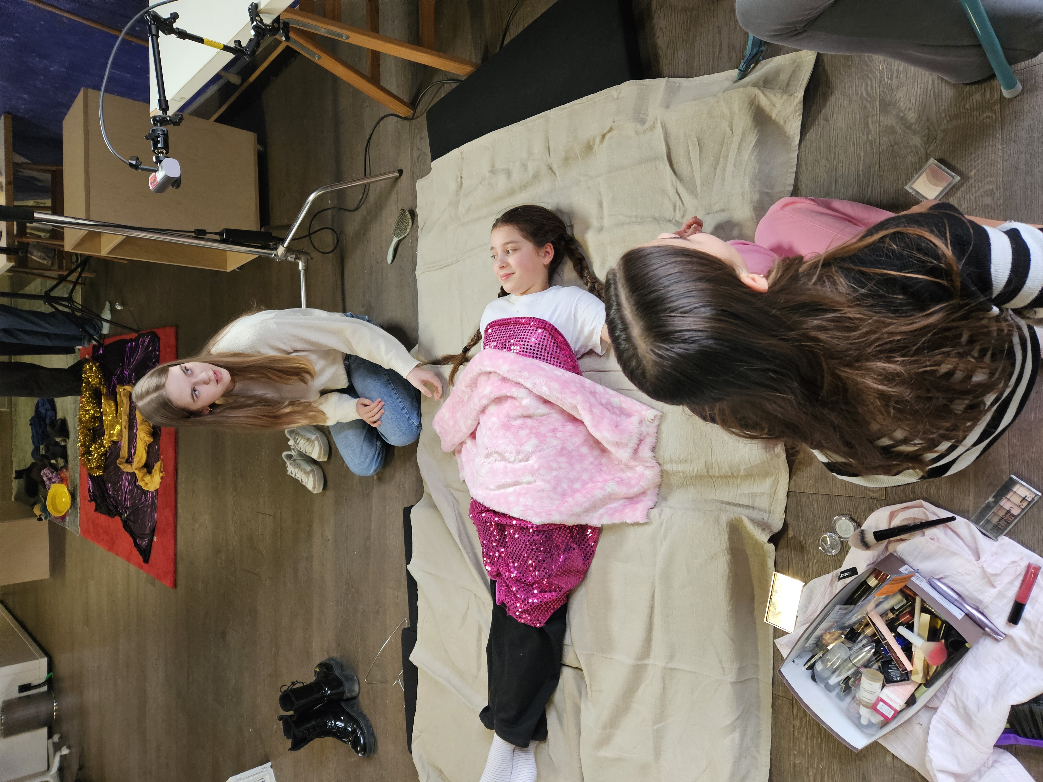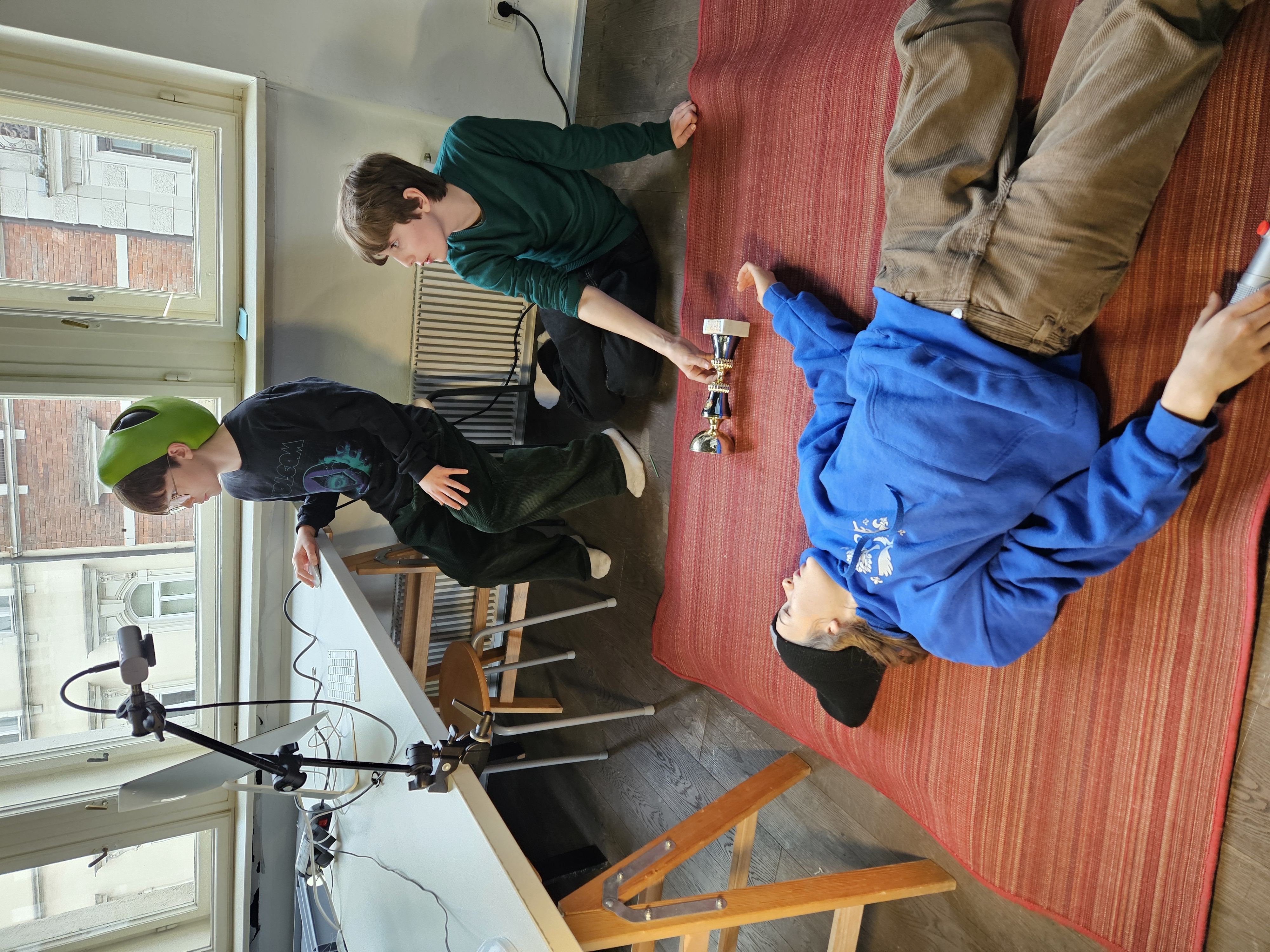 Hier wird, ebenso wie beim Legetrickfilm, mit der Kamera von oben auf darunter liegende Objekte gefilmt bzw. fotografiert. Nur dass die Objekte, die man Schritt-für-Schritt bewegt und abfotografiert dieses Mal keine ausgeschnittenen Papierformen waren, sondern unsere Schülerinnen und Schüler! Sie schlüpften auf diese Weise durch magische Portale und erlebten in Parallelwelten wilde Abenteuer: Sie kämpften gegen Aliens oder waren auf glitzernden Partys unterwegs. Einige von ihnen hatten auch großen Appetit. Oder haben wir das alles nur geträumt?